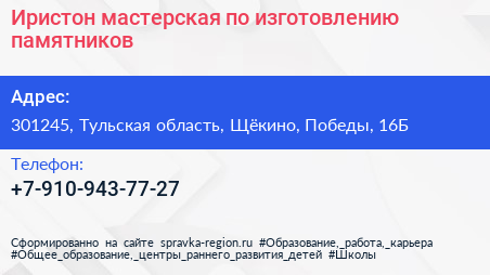 Иристон, мастерская по изготовлению памятников по адресу 301245, Тульская область, Щёкино, Победы, 16Б в дальнейшем Организация, размещена в следующих категориях:
