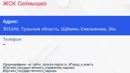ЖСК Солнышко по адресу 301246, Тульская область, Щёкино, Емельянова, 36а в дальнейшем Организация, размещена в следующих категориях: