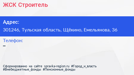 ЖСК Строитель по адресу 301246, Тульская область, Щёкино, Емельянова, 36 в дальнейшем Организация, размещена в следующих категориях: