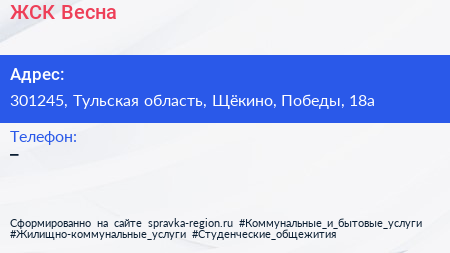 ЖСК Весна по адресу 301245, Тульская область, Щёкино, Победы, 18а в дальнейшем Организация, размещена в следующих категориях: