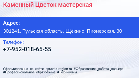 Каменный Цветок, мастерская по адресу 301241, Тульская область, Щёкино, Пионерская, 30 в дальнейшем Организация, размещена в следующих категориях:
