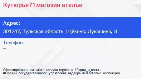 Кутюрье71, магазин-ателье по адресу 301247, Тульская область, Щёкино, Лукашина, 8 в дальнейшем Организация, размещена в следующих категориях: