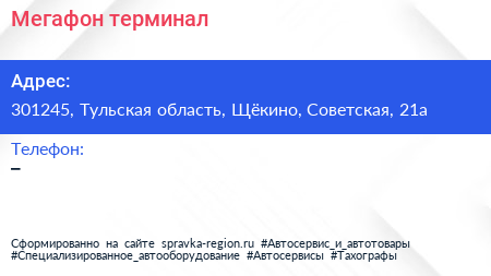 Мегафон, терминал по адресу 301245, Тульская область, Щёкино, Советская, 21а в дальнейшем Организация, размещена в следующих категориях: