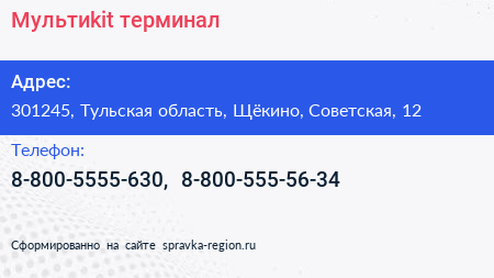 Мультиkit, терминал по адресу 301245, Тульская область, Щёкино, Советская, 12 в дальнейшем Организация, размещена в следующих категориях: