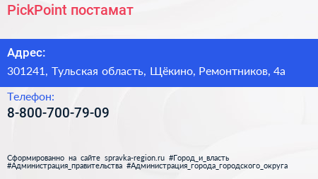 PickPoint, постамат по адресу 301241, Тульская область, Щёкино, Ремонтников, 4а в дальнейшем Организация, размещена в следующих категориях: