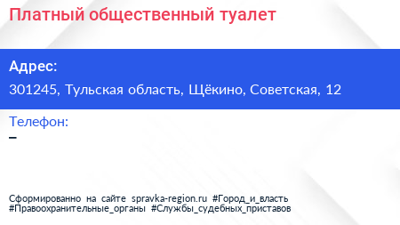 Платный общественный туалет по адресу 301245, Тульская область, Щёкино, Советская, 12 в дальнейшем Организация, размещена в следующих категориях: