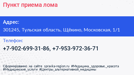 Пункт приема лома по адресу 301245, Тульская область, Щёкино, Московская, 1/1 в дальнейшем Организация, размещена в следующих категориях: