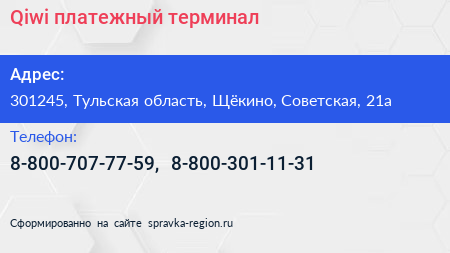 Qiwi, платежный терминал по адресу 301245, Тульская область, Щёкино, Советская, 21а в дальнейшем Организация, размещена в следующих категориях:
