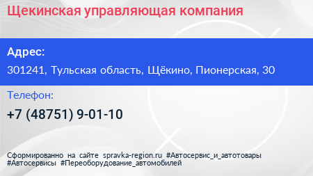 Щекинская управляющая компания по адресу 301241, Тульская область, Щёкино, Пионерская, 30 в дальнейшем Организация, размещена в следующих категориях: