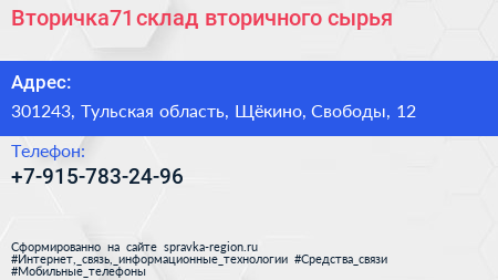Вторичка71, склад вторичного сырья по адресу 301243, Тульская область, Щёкино, Свободы, 12 в дальнейшем Организация, размещена в следующих категориях: