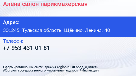 Алёна, салон-парикмахерская по адресу 301245, Тульская область, Щёкино, Ленина, 40 в дальнейшем Организация, размещена в следующих категориях: