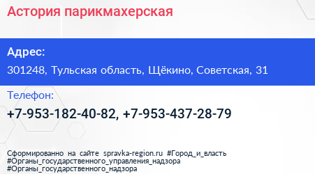Астория, парикмахерская по адресу 301248, Тульская область, Щёкино, Советская, 31 в дальнейшем Организация, размещена в следующих категориях: