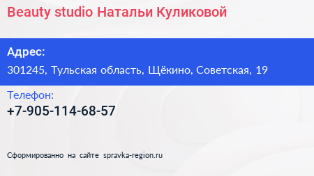 Beauty studio Натальи Куликовой по адресу 301245, Тульская область, Щёкино, Советская, 19 в дальнейшем Организация, размещена в следующих категориях: