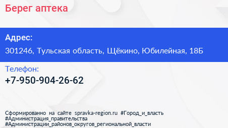 Берег, аптека по адресу 301246, Тульская область, Щёкино, Юбилейная, 18Б в дальнейшем Организация, размещена в следующих категориях: