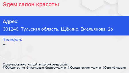 Эдем, салон красоты по адресу 301246, Тульская область, Щёкино, Емельянова, 26 в дальнейшем Организация, размещена в следующих категориях: