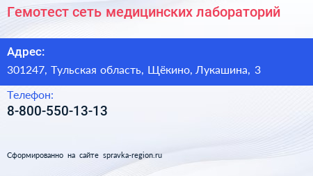 Гемотест, сеть медицинских лабораторий по адресу 301247, Тульская область, Щёкино, Лукашина, 3 в дальнейшем Организация, размещена в следующих категориях: