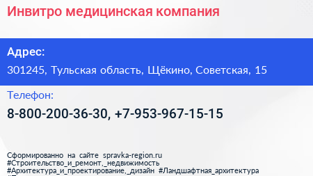 Инвитро, медицинская компания по адресу 301245, Тульская область, Щёкино, Советская, 15 в дальнейшем Организация, размещена в следующих категориях: