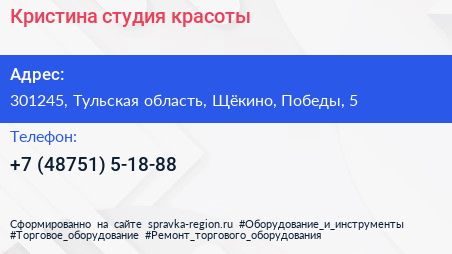 Кристина, студия красоты по адресу 301245, Тульская область, Щёкино, Победы, 5 в дальнейшем Организация, размещена в следующих категориях: