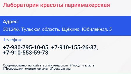 Лаборатория красоты, парикмахерская по адресу 301246, Тульская область, Щёкино, Юбилейная, 5 в дальнейшем Организация, размещена в следующих категориях: