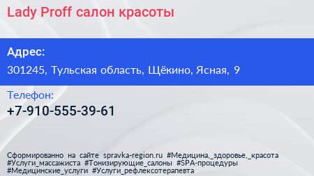 Lady Proff, салон красоты по адресу 301245, Тульская область, Щёкино, Ясная, 9 в дальнейшем Организация, размещена в следующих категориях: