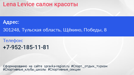Lena Levice, салон красоты по адресу 301248, Тульская область, Щёкино, Победы, 8 в дальнейшем Организация, размещена в следующих категориях: