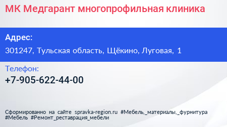 МК Медгарант, многопрофильная клиника по адресу 301247, Тульская область, Щёкино, Луговая, 1 в дальнейшем Организация, размещена в следующих категориях: