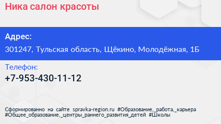 Ника, салон красоты по адресу 301247, Тульская область, Щёкино, Молодёжная, 1Б в дальнейшем Организация, размещена в следующих категориях:
