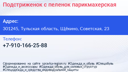 Подстриженок с пеленок, парикмахерская по адресу 301245, Тульская область, Щёкино, Советская, 23 в дальнейшем Организация, размещена в следующих категориях:
