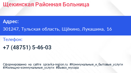 Щекинская Районная Больница по адресу 301247, Тульская область, Щёкино, Лукашина, 16 в дальнейшем Организация, размещена в следующих категориях: