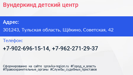 Вундеркинд, детский центр по адресу 301243, Тульская область, Щёкино, Советская, 42 в дальнейшем Организация, размещена в следующих категориях: