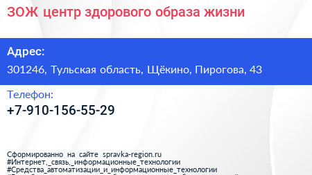ЗОЖ, центр здорового образа жизни по адресу 301246, Тульская область, Щёкино, Пирогова, 43 в дальнейшем Организация, размещена в следующих категориях: