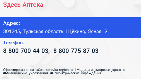 Здесь Аптека по адресу 301245, Тульская область, Щёкино, Ясная, 9 в дальнейшем Организация, размещена в следующих категориях: