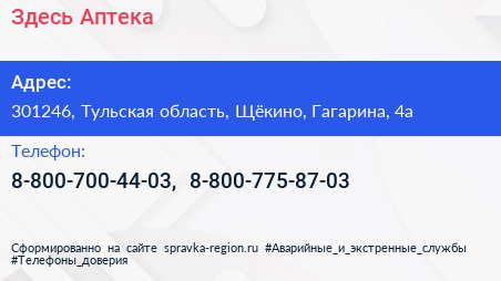 Здесь Аптека по адресу 301246, Тульская область, Щёкино, Гагарина, 4а в дальнейшем Организация, размещена в следующих категориях: