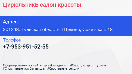 ЦирюльникЬ, салон красоты по адресу 301248, Тульская область, Щёкино, Советская, 18 в дальнейшем Организация, размещена в следующих категориях: