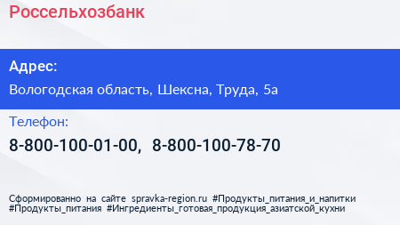Россельхозбанк по адресу Вологодская область, Шексна, Труда, 5а в дальнейшем Организация, размещена в следующих категориях: