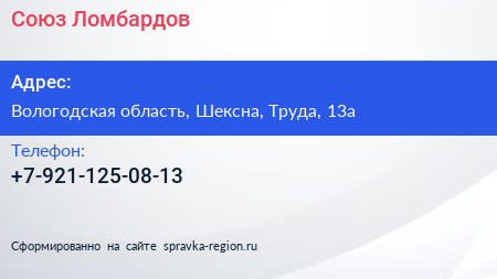 Союз Ломбардов по адресу Вологодская область, Шексна, Труда, 13а в дальнейшем Организация, размещена в следующих категориях: