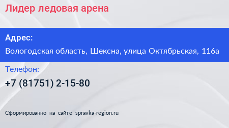 Лидер, ледовая арена по адресу Вологодская область, Шексна, улица Октябрьская, 116а в дальнейшем Организация, размещена в следующих категориях: