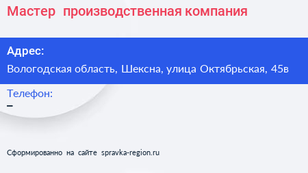 Мастер+, производственная компания по адресу Вологодская область, Шексна, улица Октябрьская, 45в в дальнейшем Организация, размещена в следующих категориях: