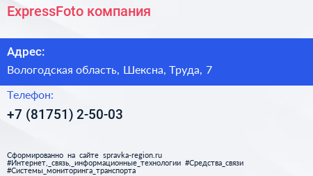 ExpressFoto, компания по адресу Вологодская область, Шексна, Труда, 7 в дальнейшем Организация, размещена в следующих категориях: