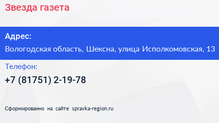 Звезда, газета по адресу Вологодская область, Шексна, улица Исполкомовская, 13 в дальнейшем Организация, размещена в следующих категориях: