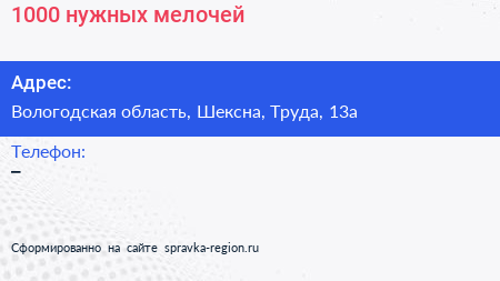 1000 нужных мелочей по адресу Вологодская область, Шексна, Труда, 13а в дальнейшем Организация, размещена в следующих категориях: