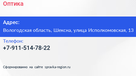 Оптика по адресу Вологодская область, Шексна, улица Исполкомовская, 13 в дальнейшем Организация, размещена в следующих категориях: