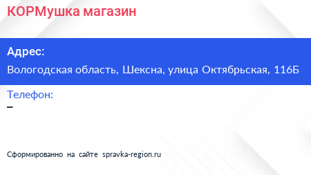 КОРМушка, магазин по адресу Вологодская область, Шексна, улица Октябрьская, 116Б в дальнейшем Организация, размещена в следующих категориях: