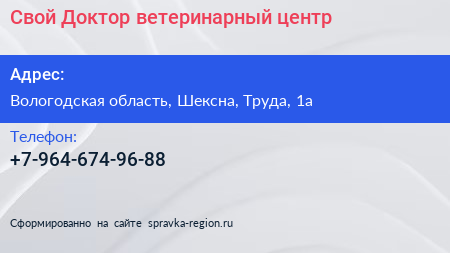 Свой Доктор, ветеринарный центр по адресу Вологодская область, Шексна, Труда, 1а в дальнейшем Организация, размещена в следующих категориях:
