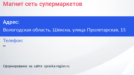 Магнит, сеть супермаркетов по адресу Вологодская область, Шексна, улица Пролетарская, 15 в дальнейшем Организация, размещена в следующих категориях: