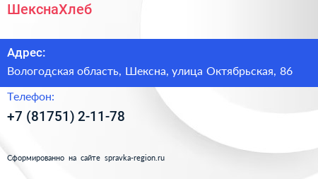 ШекснаХлеб по адресу Вологодская область, Шексна, улица Октябрьская, 86 в дальнейшем Организация, размещена в следующих категориях:
