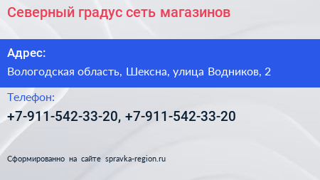 Северный градус, сеть магазинов по адресу Вологодская область, Шексна, улица Водников, 2 в дальнейшем Организация, размещена в следующих категориях: