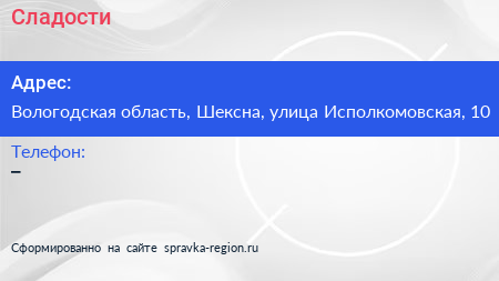 Сладости по адресу Вологодская область, Шексна, улица Исполкомовская, 10 в дальнейшем Организация, размещена в следующих категориях: