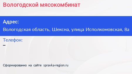 Вологодской мясокомбинат по адресу Вологодская область, Шексна, улица Исполкомовская, 8а в дальнейшем Организация, размещена в следующих категориях: