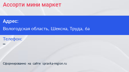 Ассорти, мини-маркет по адресу Вологодская область, Шексна, Труда, 6а в дальнейшем Организация, размещена в следующих категориях: